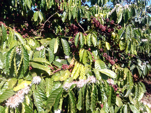 Vườn cà phê của gia đình chị Nguyễn Thị Mai, thôn 7, xã Đắk Ha (Đắk Glong) nở hoa khi đang thu hoạch