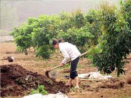 + Chiếu theo mép tán ra 30cm, đào rãnh 20 x 20cm vòng quanh tán. Phân bón trộn, rải đều xuống rãnh, lấp đất bằng phẳng rồi tưới nước hoặc hoà nước phân chuồng tưới đều quanh tán; lấy đất phù sa, bùn ao (để ải, phơi khô, đập nhỏ), không đổ quá nhiều và quá dày (chỉ dày 5 – 7cm).